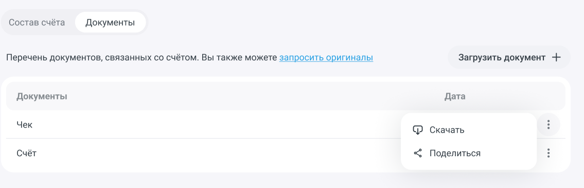 Также во вкладке "Документы" вы можете загрузить дополнительные документы по счёту в систему